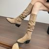 Vintage Pileli Kadın Diz Boyu Çizme Ayakkabı Sonbahar Kış Bayanlar Zarif Kare Burun Kalın Topuk Uzun Botlar