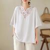 Vintage Short Sleeve Loose Pullovers Female Clothing Folk Fashion Embroidery Korean Spliced Summer Casual V-Neck Basic T-shirt