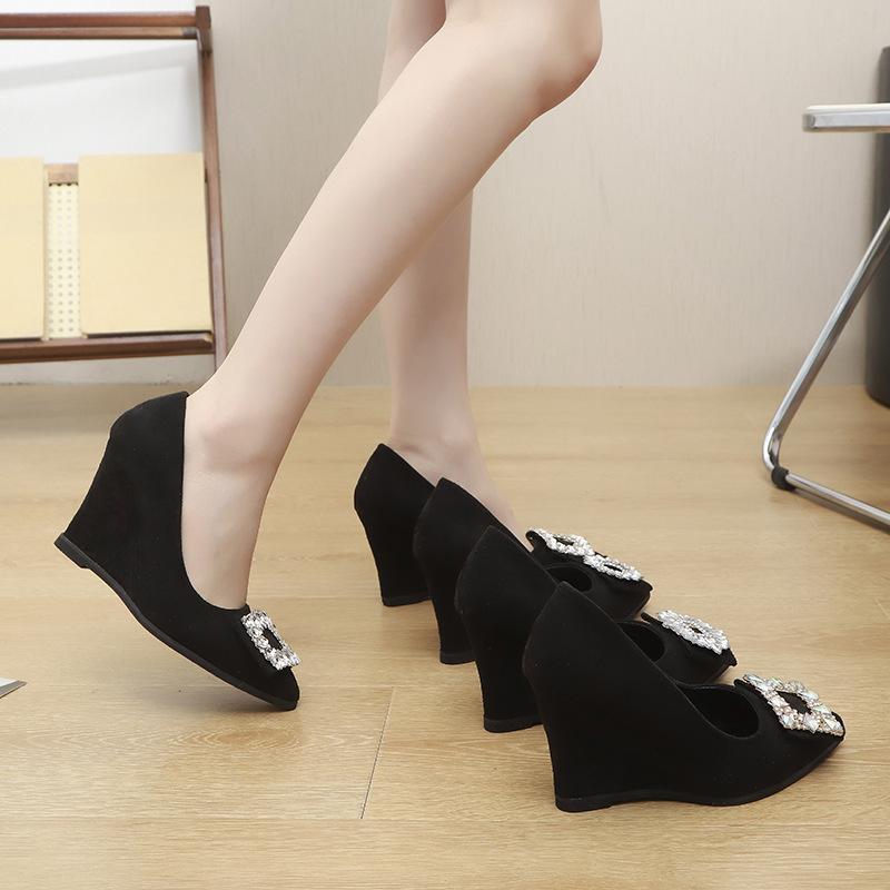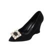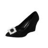 New pointed square buckle rhinestone black high heels women's fine heel temperament versatile single shoes shallow mouth