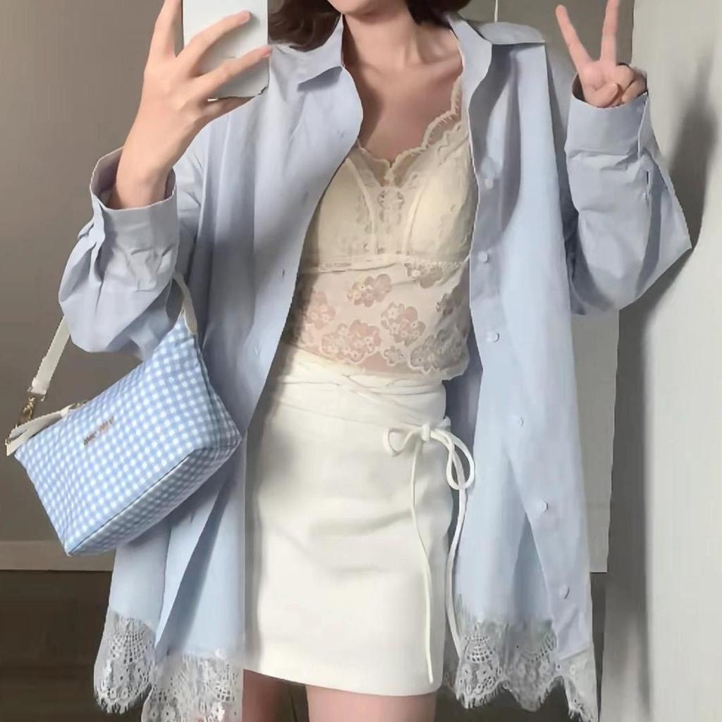 Korean-Style Women's Blue Polo Collar Lace Patchwork Shirt - Loose Fit, Slimming, Early Spring 2025 Niche Design.