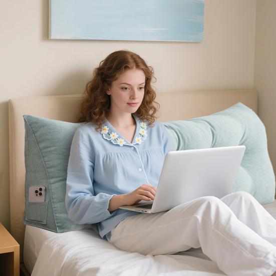Enhance your comfort and relaxation with our headboard pillow featuring a convenient side pocket for storing essentials like your phone or remote control. The ergonomic design molds to your body, offering soft support for shoulders, back, and waist. Crafted from high-quality comfort fabric, this wedge-shaped pillow ensures lasting softness and comfort. Use it as a bolster cushion for back support while reading, gaming, or napping.