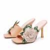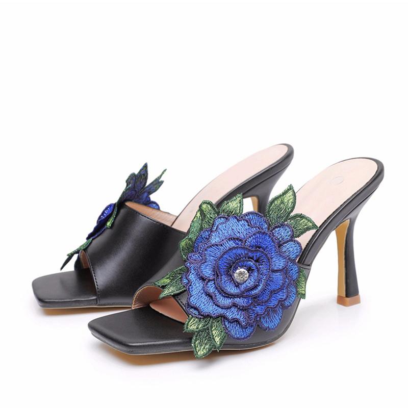 Fashion Liyke High Quality Handmade Embroidery Flower Women Slippers Sandals Fashion Square Open Thin Heels Shoes Female Mules Slides