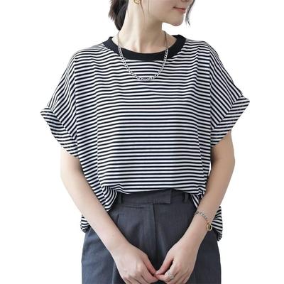 Beams Heart Tee with Tucked Sleeves and Striped Striped Off One Size S/S Pullover, Women's, White,