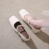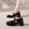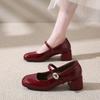 2025 new autumn red one-word with pearl buckle high heels patent leather square head Mary Jane shoes thick heel single shoes