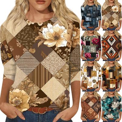Women's Fashion Casual Round Neck Three-quarter Sleeve Retro Floral Print T-shirt Top