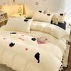 Korean Style Pink Bedding Set Black Cat Embroidery Washed Cotton Duvet Cover Cute Cardboard Bed linen Comforter Sets