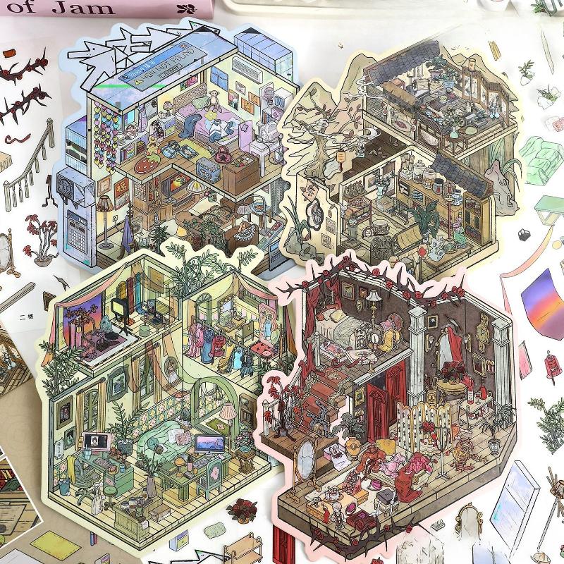 3D Miniature House Sticker Sheet Vintage Diorama Scenery Decals for Journaling Retro Room Landscape Stickers for Scrapbooking