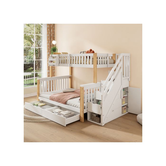 Lit d'enfant multifonctionnel - MUVOE - Blanc + couleur naturelle - 2 places - Avec tiroirs - Design évolutif