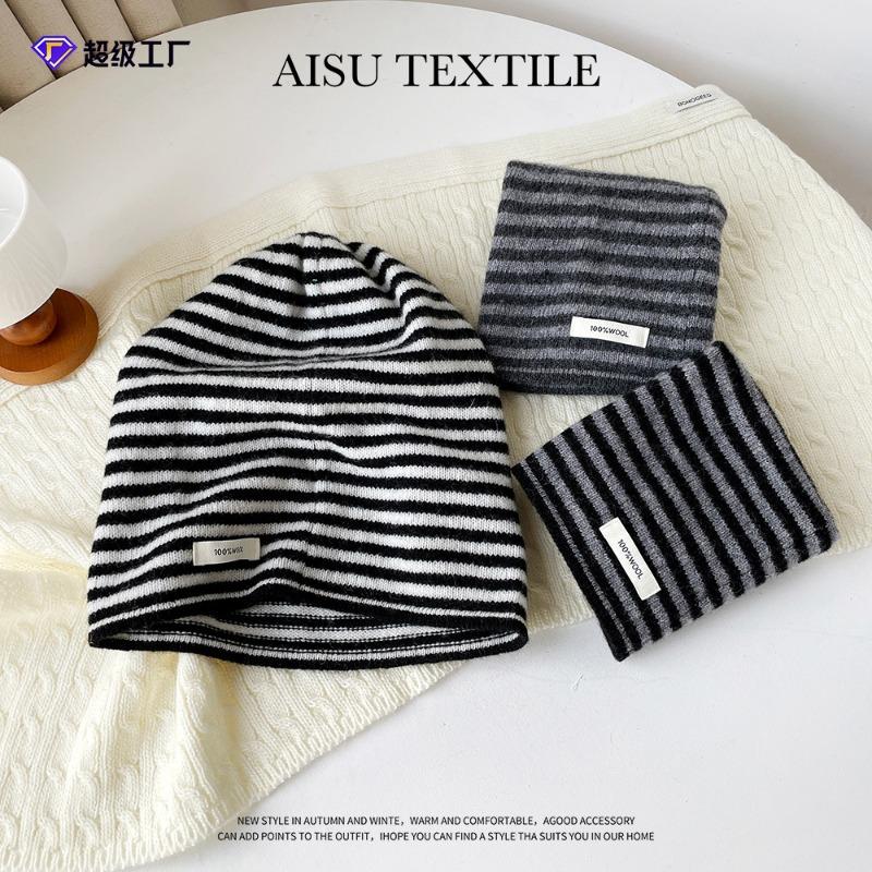 0% all wool striped knitted hat stacking hat women's autumn and winter bag head cold hat versatile warm hat