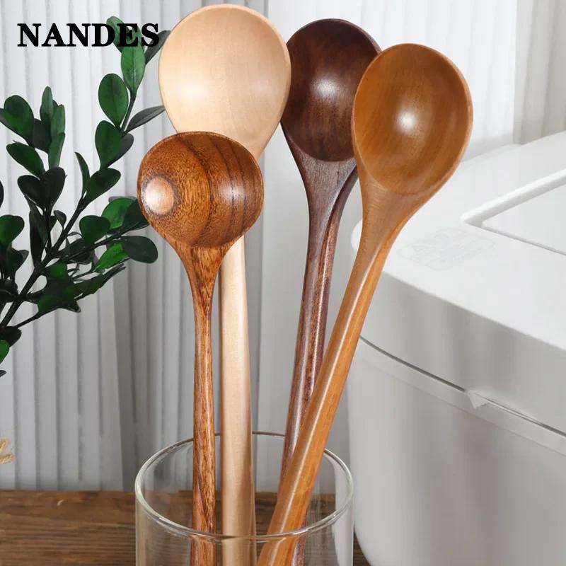 Korean Long Wooden Spoons Natural Coffee Stirring Rod Tea Dessert Spoon Handle Round for Soup Tableware Kitchen Supplies