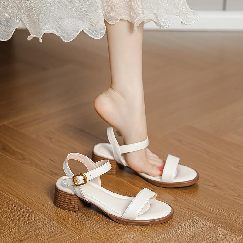 Summer new sandals women step on shit feeling medium heel thick heel one-word buckle belt Roman shoes wear holiday casual beach shoes