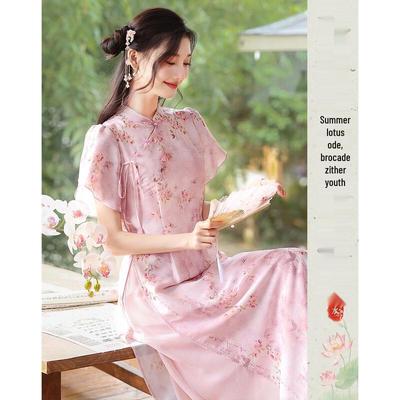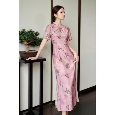 JK&JS New Chinese Style Short Sleeve Jacquard Satin Qipao Dress