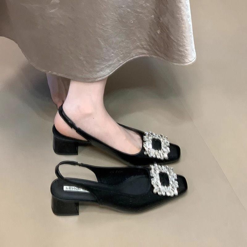 Women's Baotou Sandals Women's Summer 2025 New French Temperament Evening Fairy Rhinestone Thick Heel Silver Single Shoes Women