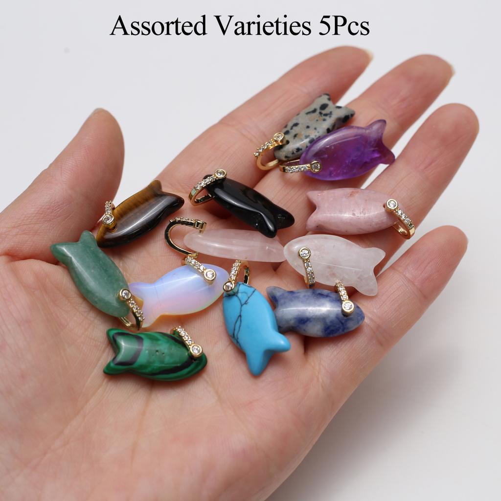 5Pcs, Natural Stone Crystal Rose Quartz Malachite Gemstone Pendant, Boho Handmade Small Fish Charms for Jewelry Making DIY Crafts, Unisex Gift 12×18mm