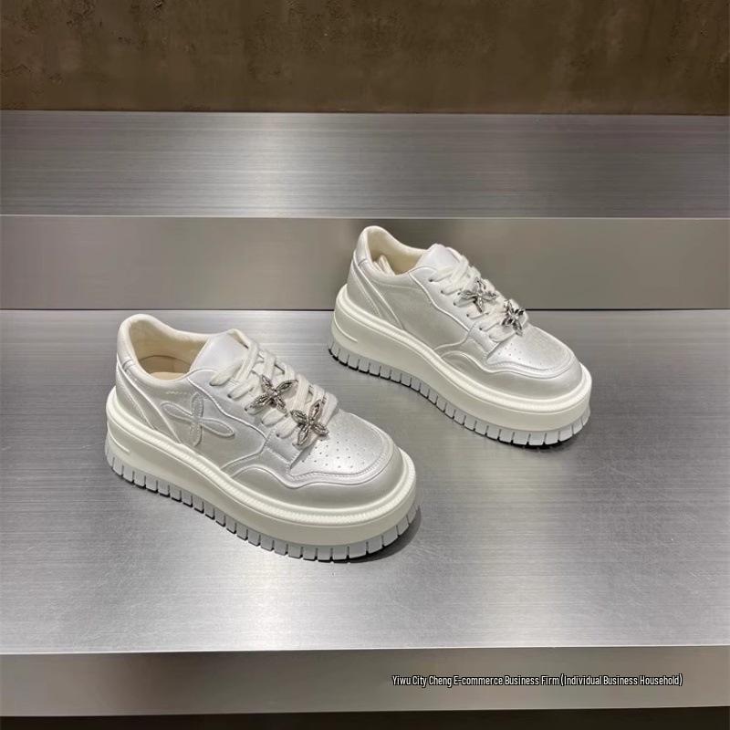 Women's Rhinestone Platform White Sneakers - Thick-Soled, Versatile Height-Increasing, Round-Toe Casual Shoes for Spring 2025.