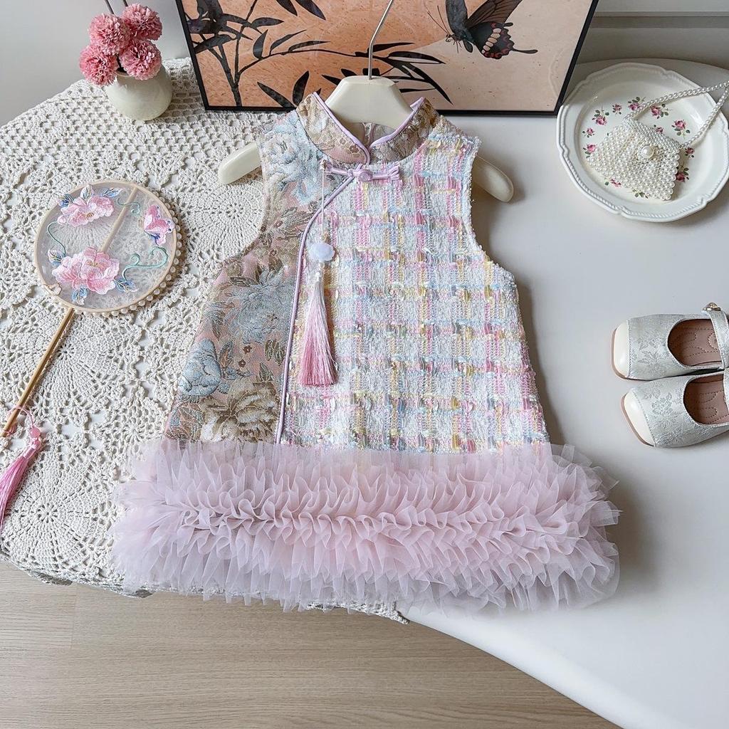 This elegant girls' winter dress combines traditional Hanfu and Cheongsam styles with a modern twist. Crafted from high-quality polyester, it ensures comfort and warmth during the colder months. The dress features a sleeveless design, allowing for easy layering with your favorite jackets or cardigans. The highlight of the dress is its beautiful mesh skirt, adding a delicate and whimsical touch. Perfect for festive occasions or cultural celebrations, this dress offers a unique blend of heritage and contemporary fashion, making it a standout piece in any wardrobe.