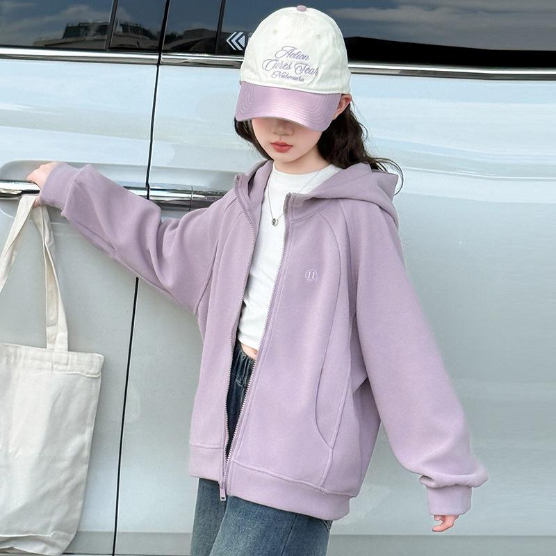 Introducing a stylish two-piece set for girls, perfect for autumn 2025. This fashionable outfit includes a sporty hooded jacket and a pair of jeans, designed to keep kids comfortable and trendy. The jacket features long sleeves, ideal for cooler weather, and both pieces are crafted from high-quality cotton material, ensuring softness and durability. This set is a perfect blend of fashion and function for active young ones.