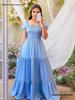 Elbise, zarafet ve çekicilik yayan geniş bir siluete sahip uzun, düz renkli bir eteğe sahiptir.. Tarihler, partiler, ziyafetler, düğünler ve akşam partileri için ideal olan bu elbise, gardırobunuza çok yönlü bir ektir.