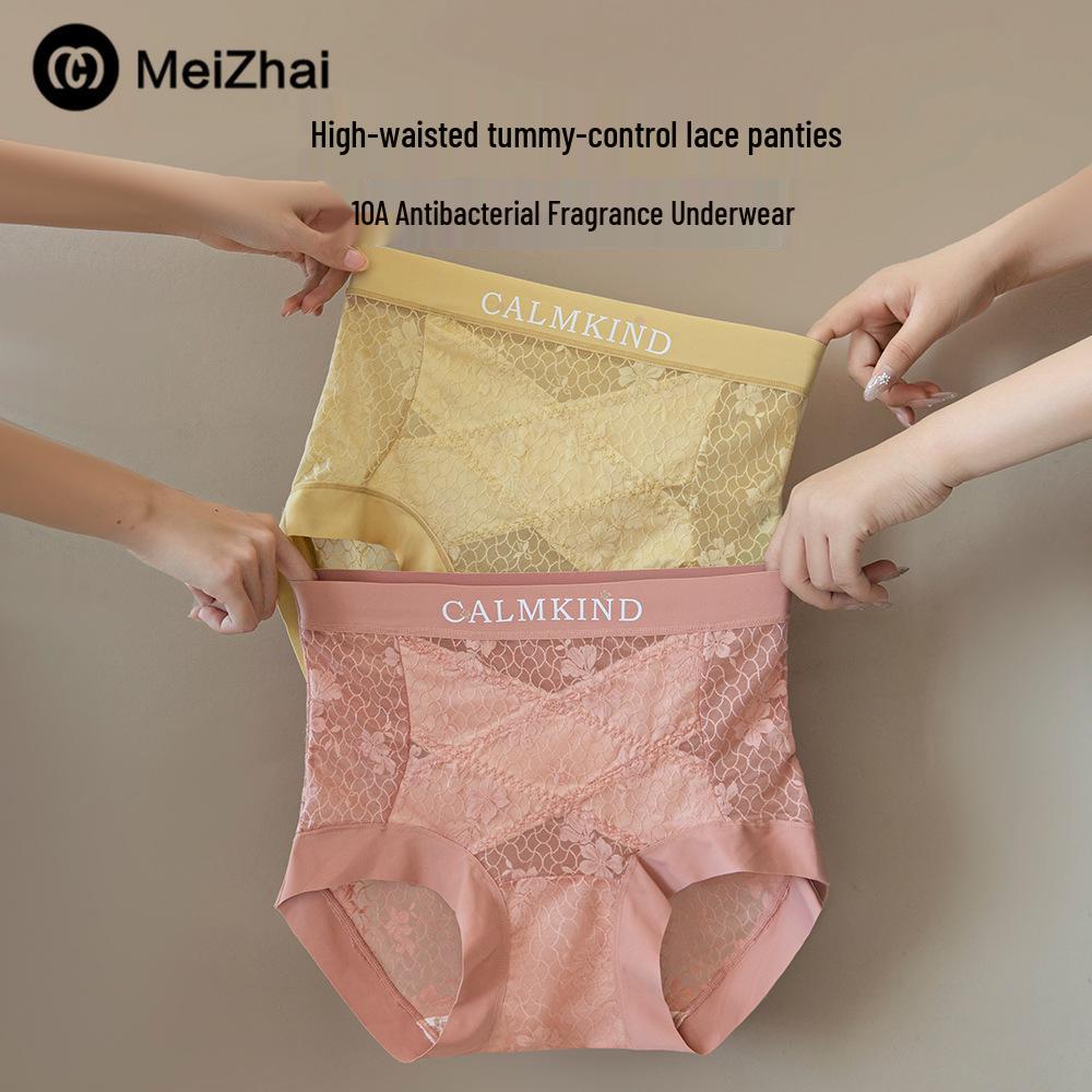 Meizhai Women's Seamless Lace Mid-High Waist Tummy Control Plus Size Briefs with Antibacterial Mulberry Silk Crotch.