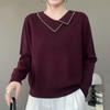 Spring Autumn Women's V-Neck Knitted Sweater Loose Solid Pullover Knitwear Thin Rhinestone Knit Top