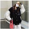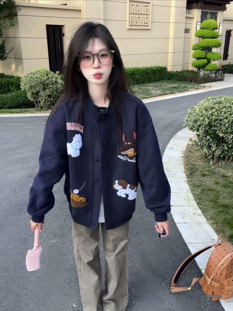 Embrace a playful and cozy style with this women's chenille cardigan sweatshirt, perfect for the autumn season. This loose-fitting piece features vibrant cartoon embroidery that adds a fun and unique touch to your wardrobe. The long sleeves and stand neckline offer both warmth and comfort, while its thin polyester material ensures it remains lightweight and versatile. Designed in a relaxed Korean lazy style, this casual baseball jacket effortlessly combines comfort and fashion for a laid-back, yet stylish look.