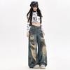 Discover the perfect blend of urban edge and autumnal charm with these ripped wide-leg jeans for women. Crafted from durable denim, these jeans feature a high waistline that effortlessly flatters your figure. The standout element is the frayed decoration, adding a bold, graffiti-inspired touch to your fall wardrobe. Ideal for those who love to express their unique style, these jeans are a must-have for the fashion-forward individual looking to make a statement this season.