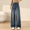 Experience ultimate comfort and style with these versatile, floor-length jeans. Designed with a high waistline for a slimming effect, these retro blue jeans offer a straight leg fit that is both modern and timeless. Made from a premium cotton material, they ensure softness and durability. The sportive design makes these jeans perfect for casual outings or a chic everyday look. Enjoy the freedom of movement with a loose fit that flatters all body types.