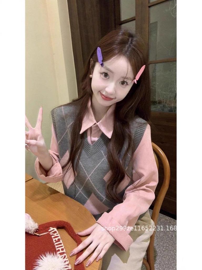 Korean Pink Knit Vest and Shirt Two-Piece Set - Women's College Style Spring/Autumn JK Uniform