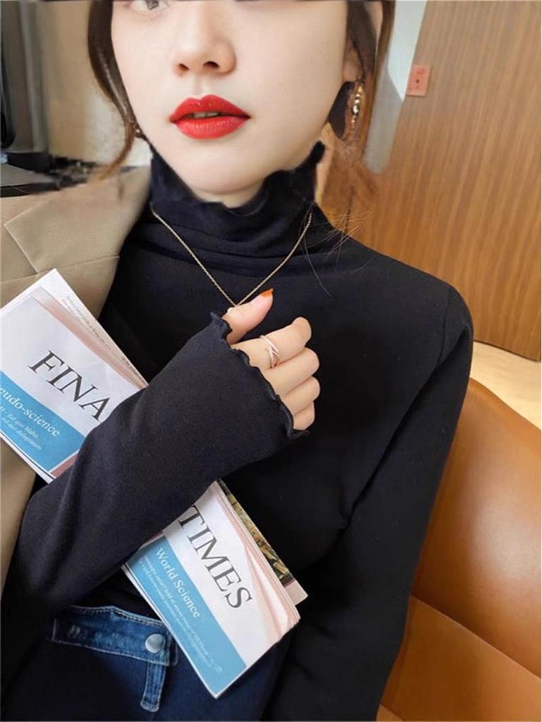 Double-Sided Velvet Frilled High-Collar Long Sleeve Women's T-Shirt - Autumn/Winter Fashion, High Elastic, Versatile.