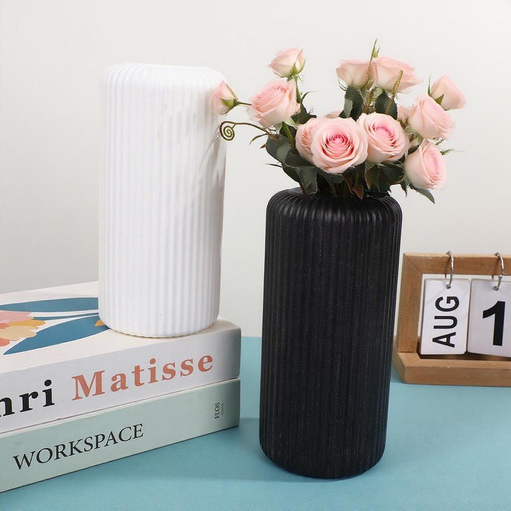 Japanese White Faux Ceramic Striped Vase - Retro Tabletop Ornament for Living Room, Hydroponic Decor
