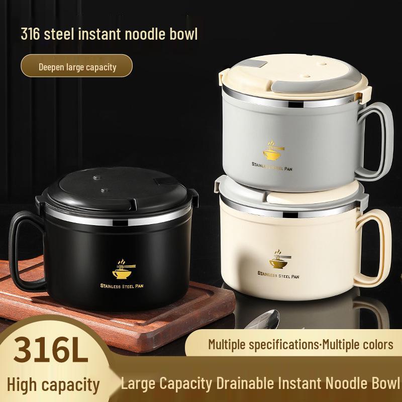 316 Food-Grade Stainless Steel Noodle Bowl with Lid and Drain for Dorm or Canteen; Easy-to-Clean.