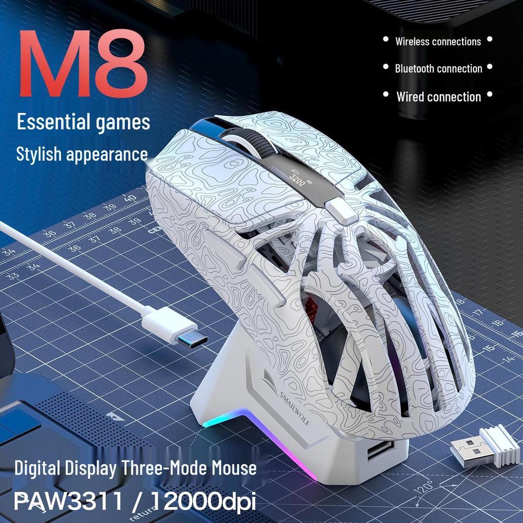 Smailang M8 Wireless Gaming Mouse - Esports Bluetooth, PAW3311 Sensor, 3 Modes, Screen Display, Charging Dock, USB.