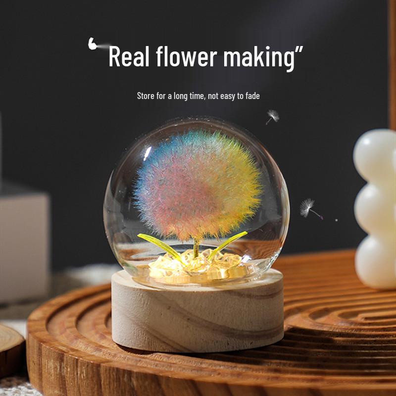 Luminous Dandelion Preserved Flower Bouquet Night Light in Glass Dome - Birthday Gift for Girls or Girlfriend
