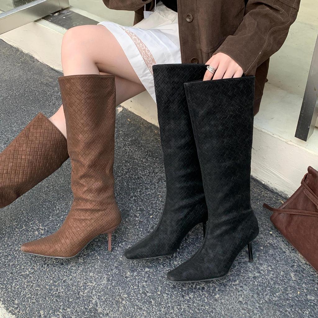 2025 autumn and winter new fashionable retro simple square head high-heeled boots simple wind fine high-heeled long boots but knee boots
