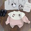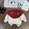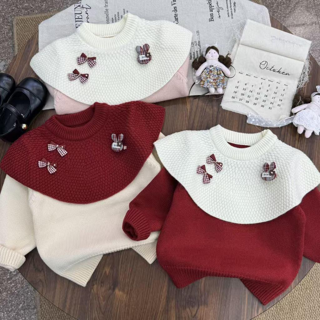 Girl's Red Rabbit Bow Ruffle Knit Sweater - Round Neck, Autumn/Winter Collection