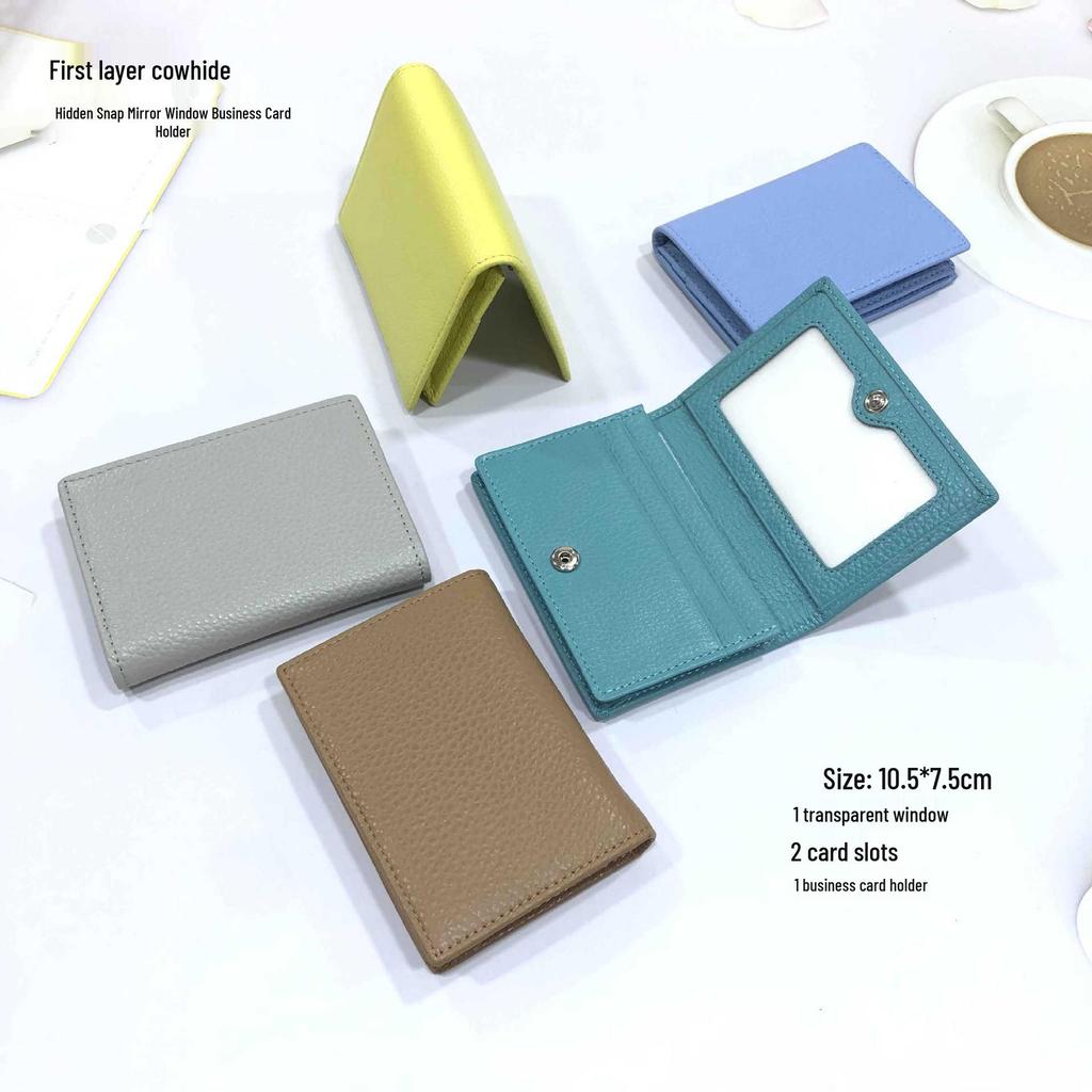 Premium Leather Card Holder: Unisex Cowhide Business Case with Mirror Window, Snap Closure & Coin Purse.