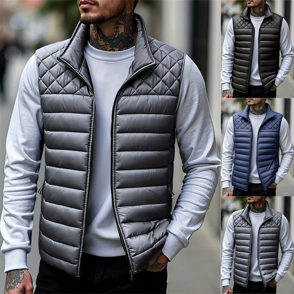 Men's Solid Color Fleece-lined Zip-up Vest, Stand Collar, Sleeveless, Outdoor Casual Warm Vest Jacket