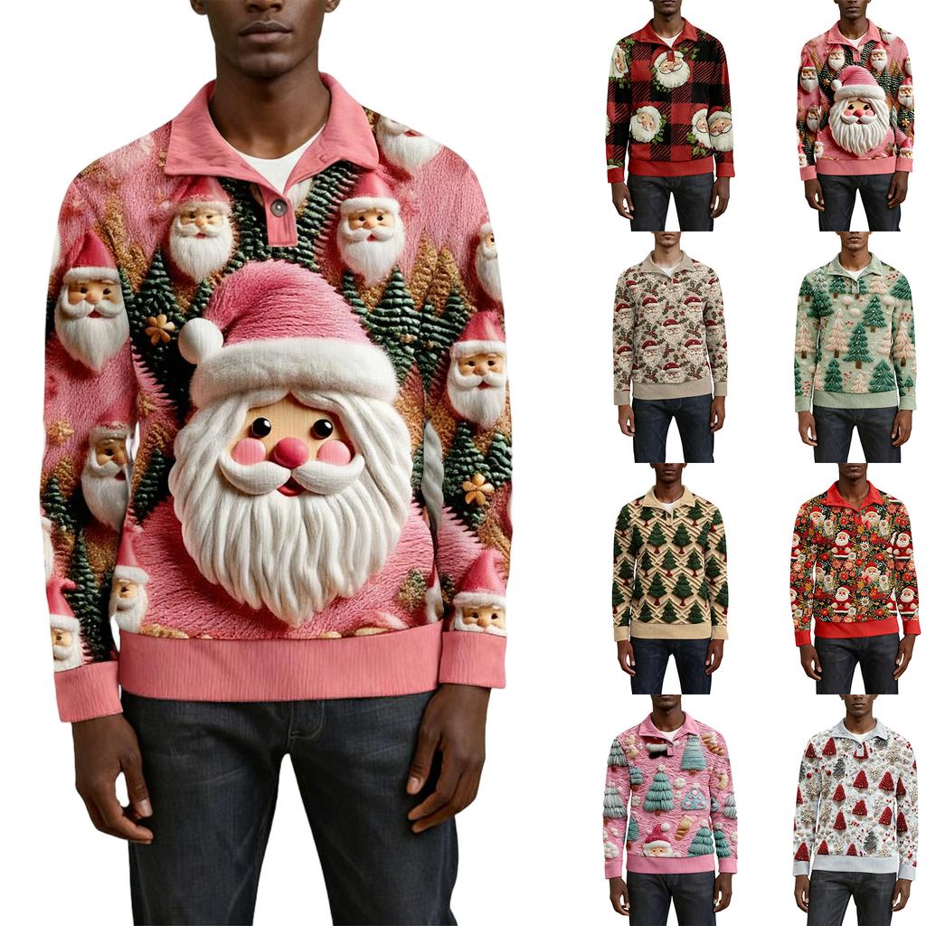 Erkek Noel Pamuklu Kazak Uzun Kollu Dış Giyim Gömleği Vintage Kadife Düğmeli Dik Yaka Gömlek Günlük Sweatshirt Noel Baskılı Üst