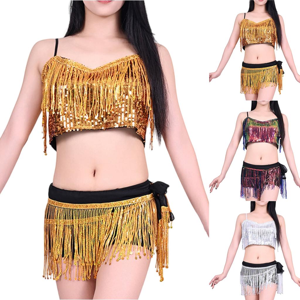 Ladies Belly Dance Waist Chain And Hip Wrap Set With Sequins And Fringe - Sexy Performance Wear Dance Costume Set