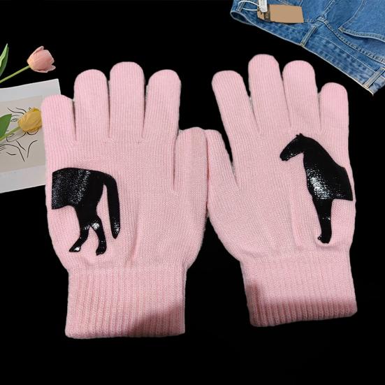 Unique Design: Featuring a creative black horse print split across both gloves, the design forms a complete and striking horse image when worn together. This minimalist yet eye-catching embellishment adds a fashionable touch to the solid color gloves, blending style with subtle elegance.