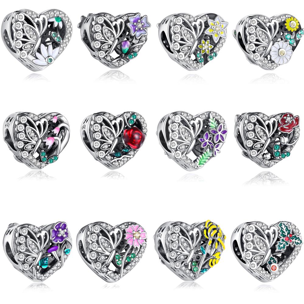 Shiny Copper Pavé White Zircon Butterfly & Flower Dangle Charm Fits Brand Bracelet For Family Christmas Gift