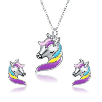 Trendy Rainbow Pony Pendant Earring Necklace Set With Colorful Gradient Design