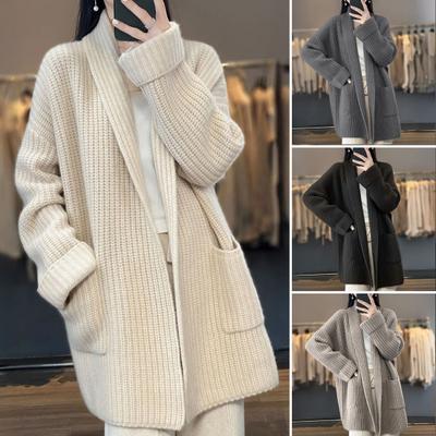 Kadın Sonbahar Kış Hırka Kazak Açık Dikiş Örme Cepler Yaka Gevşek Kalın Sıcak Yumuşak Elastik Uzun Kollu Artı Boyutu Orta Uzunluk Bayan Ceket Ceket