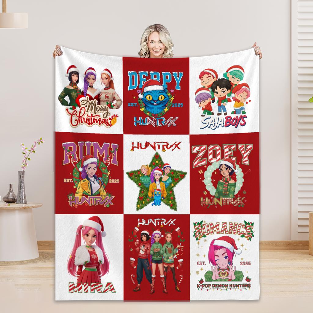 1pc Christmas Kpop Blanket Red Flannel Blanket Demon Hunters Print for Home Living Room Bedroom Decor New Year Christmas Gift