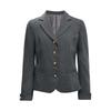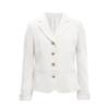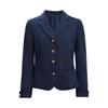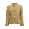 Yaka detaylı, altın düğmeli, manşetleri kıvrılmış ve iki fonksiyonel cepli, uzun kollu takım ceket zarif ve şık bir görünüm sunar.