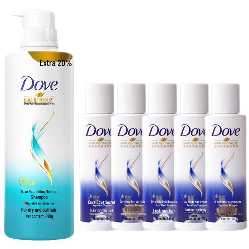 Experience nourished and moisturized hair with this Dove Nourishing Moisture Shampoo set. Designed for normal hair and various scalp types, it deeply cleanses, helps control dandruff, and leaves hair feeling voluminous, fluffy, and clean. This pack includes one 480g bottle and five 100g bottles of shampoo.