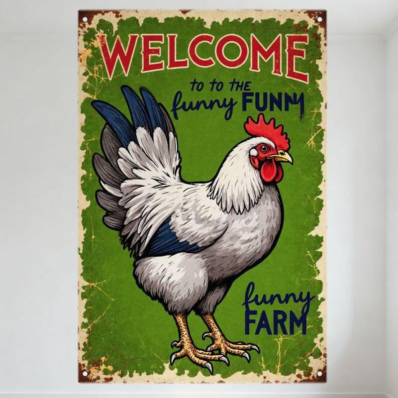Vintage Rustic Metal Tin Sign, Welcome to Funny Farm with Rooster Chicken, Distressed Retro Wall Decor for Home Bar Café Man Cav