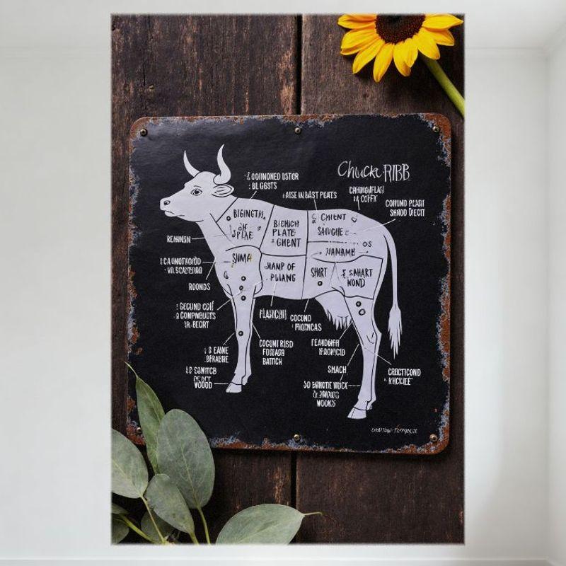Rustic Distressed Cow Anatomy Meat Cuts Metal Tin Sign with Sunflower Eucalyptus for Bar Restaurant Man Cave Home Decor