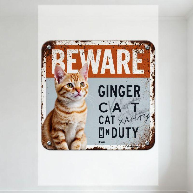 Vintage Distressed Rusty Metal Sign 'Beware Ginger Cat on Duty' with Kitten Image - Rustic Wall Plaque for Home Bar Man Cave Caf