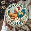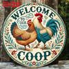 Vintage Welcome to Our Coop Metal Tin Sign, Rustic Brown Framed Decor with 5 Colorful Chickens, Country-Style Farmhouse Wall Art